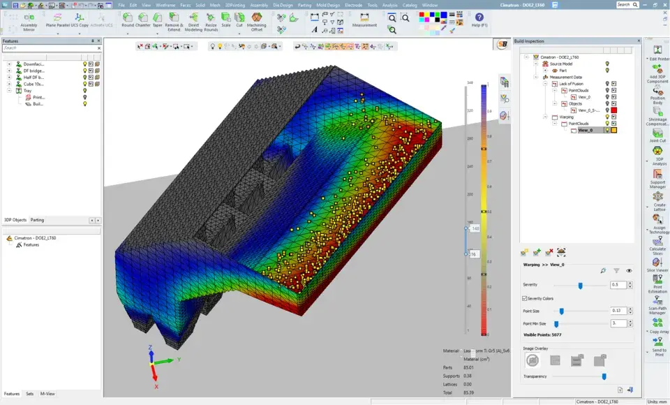 Nossa equipe de cientistas e engenheiros de materiais e processos desenvolveu algoritmos que mostram um alto nível de correlação com os resultados das tomografias computadorizadas, permitindo uma detecção automatizada e pós-construção de incidentes. Em um estudo, foi verificada uma correlação de 100% dos resultados da análise de Inspeção DMP com a falta de fusão (LoF) encontrada nos dados da tomografia computadorizada para defeitos > 200 μm para uma variedade representativa de testes de peças em LaserForm Ti Gr23 (A) e em Maraging Steel (A) produzidas na impressora 3D de metal DMP 320.